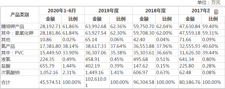 招股书显示,华融化学的产品可分为精细钾产品和氯产品两类,主要产品包括氢氧化钾、聚酯乙烯树脂(PVC)、盐酸、次氯化钠以及液氯等。2020年11月,华融化学关停了聚氯乙烯树脂产品生产线,优化产品结构,提高氯产品的附加值,提升绿色循环和可持续发展的能力。报告期内,华融化学的主营业务收入按产品分类具体如下: