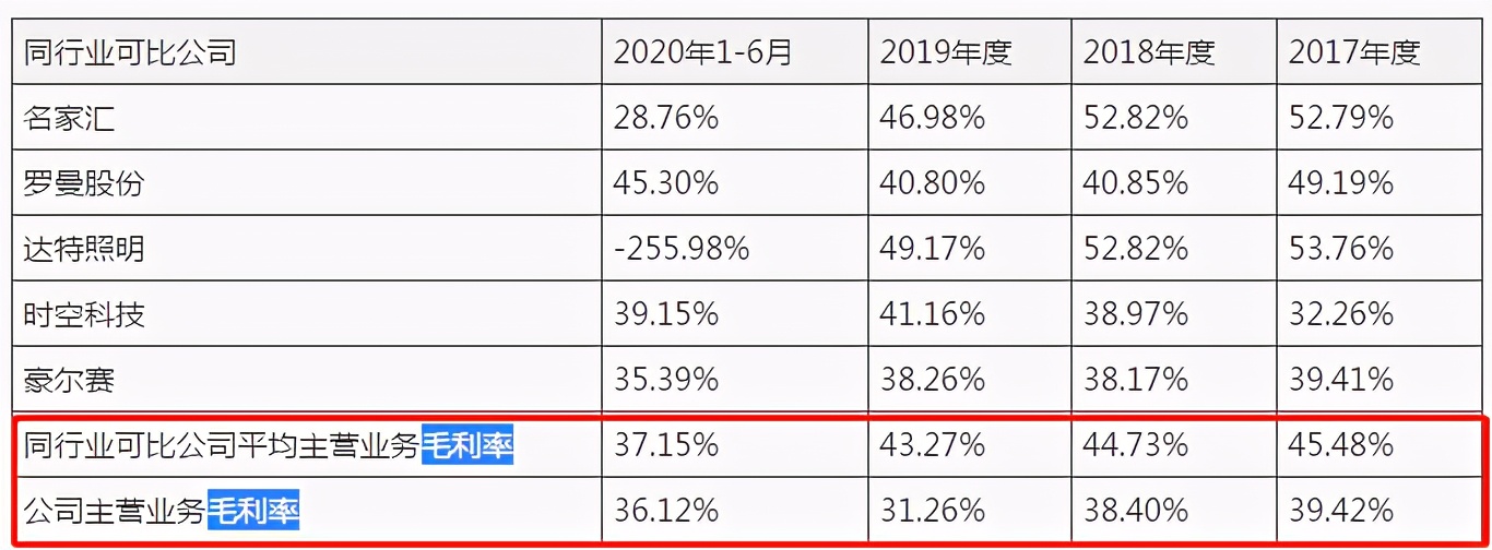 2017-2020年上半年,公司主营业务毛利率分别为39.42%、38.40%、31.26%和36.12%,同行业可比公司主营业务毛利率平均值分别为45.48%、44.73%、43.27%及37.15%。金照明前三期的毛利率处在直线下滑趋势,2020年上半年的毛利率虽然有所回暖,但是仍低于同行业可比公司。