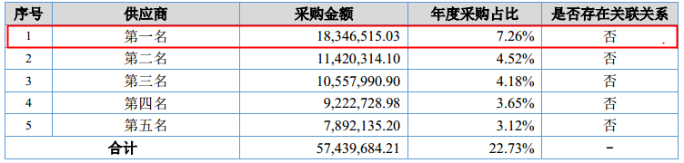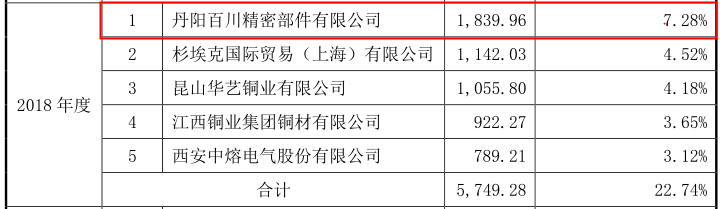 招股书显示,瑞可达2018年对第一大供应商丹阳百川精密部件有限公司的采购额为1,839.96万元,而年报显示的对不具名披露的第一大供应商的采购额为1,834.65万元,比招股书少5.31万元。招股书与2018年年报披露的后四名供应商及其采购额则一致。