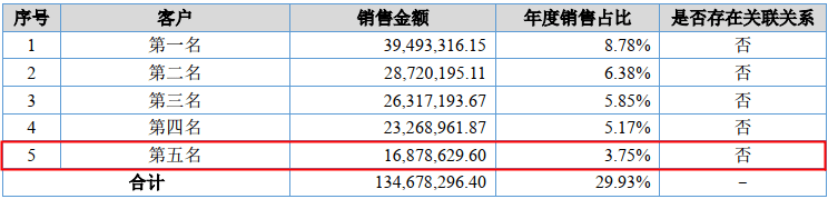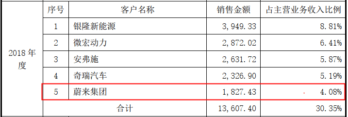 此外,瑞可达2018年对第五大客户蔚来集团的销售额为1,827.43万元,年报显示,其对不具名披露的第五大客户的销售额为1,687.86万元,与对第五大客户蔚来集团的销售额最为接近,但也比招股书披露的少了139.57万元。
