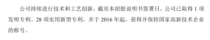 招股书显示,超越环保持续进行技术和工艺创新,截至本招股说明书签署日,公司已取得1项发明专利、28 项实用新型专利。专利是企业掌握关键技术的重要体现,是衡量一个企业科技创新实力的关键。具有一定数量的核心专利,可以有效提升企业的核心竞争力,从而使企业获得更广阔的市场空间。超越环保仅有一项发明专利,是如何承担起国家高新技术企业的称号?