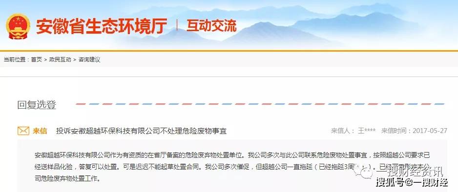我们《一搜财经》还发现,2017年5月27日,根据安徽省环保厅投诉信息显示,有公司投诉安徽超越环保科技有限公司不处理危险废物事宜。