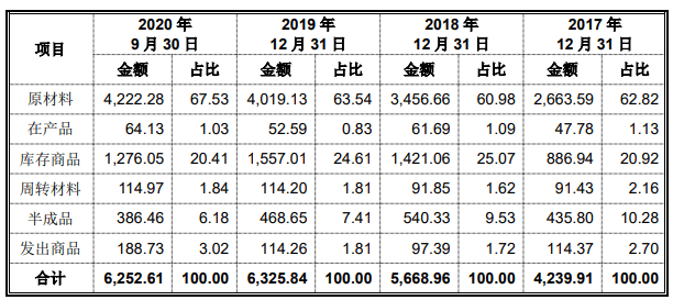 2017年-2019年及2020年1-9月各期末,唯赛勃存货规模保持较高水平,且存货账面价值逐年增加,分别为4239.91万元、5668.96万元、6325.84万元和6252.21万元,占流动资产的比例分别为24.80%、25.14%、24.34%和26.85%。