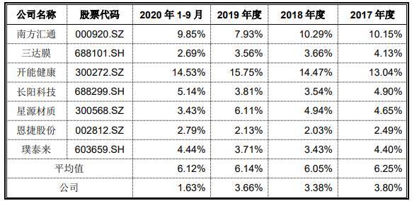 2017年-2019年及2020年1-9月,唯赛勃毛利率分别为39.30%、37.57%、40.51%、36.37%,行业平均值分别为40.45%、39.09%、38.44%、38.77%。