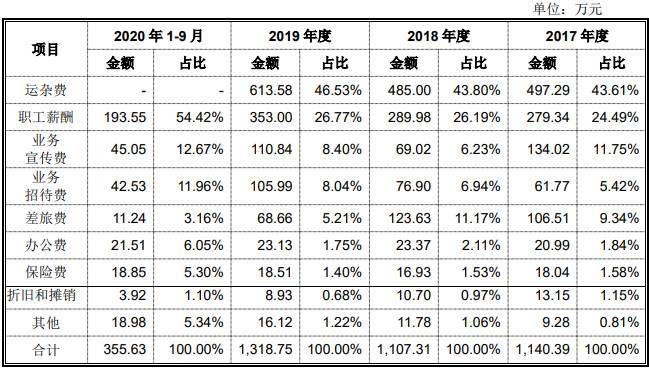 2017年-2019年及2020年1-9月,唯赛勃销售费用分别为1140.39万元、1107.31万元、1318.75万元和355.63万元,占营业收入的比例分别为3.80%、3.38%、3.66%和1.63%。各期,同行业可比公司销售费用率平均值分别为6.25%、6.05%、6.14%、6.12%。