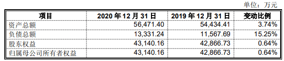截至2020年末,资产总额为5.65亿元,同比增长3.74%;负债总额为1.33亿元,同比增长15.25%。