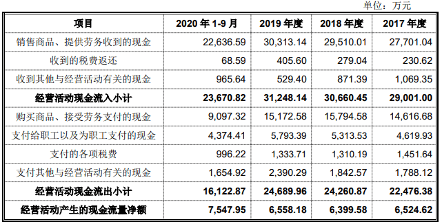 2017年-2019年及2020年1-9月,唯赛勃营业收入分别为3.00亿元、3.28亿元、3.61亿元、2.18亿元,销售商品、提供劳务收到的现金分别为2.77亿元、2.95亿元、3.03亿元、2.26亿元。