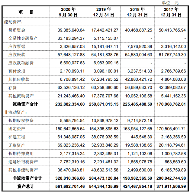 2017年-2019年及2020年1-9月,唯赛勃资产总计分别为3.72亿元、4.24亿元、5.44亿元、5.62亿元,其中流动资产合计分别为1.71亿元、2.25亿元、2.60亿元、2.33亿元。