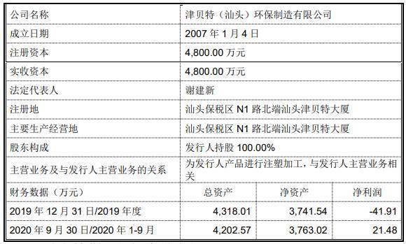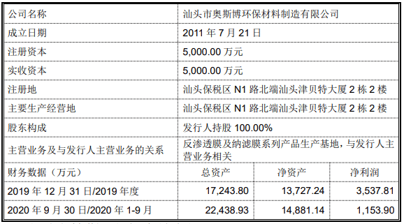 2019年及2020年1-9月,汕头津贝特净利润分别为-41.91万元、21.48万元;汕头奥斯博净利润分别为3537.81万元、1153.90万元;汕头善纯净利润分别为-72.04万元、-46.45万元;唯赛勃环保设备净利润分别为0.18万元、-67.66万元;美国唯赛勃净利润分别为100.00万元、55.83万元;上海奥斯博净利润分别为3.59万元、2.62万元;爱舍尔科技净利润分别为-315.58万元、-24.54万元。