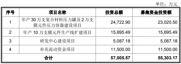 唯赛勃拟募资5.53亿元中,2.30亿元用于“年产30万支复合材料压力罐及2万支膜元件压力容器建设项目”、1.57亿元用于“年产10万支膜元件生产线扩建项目”。