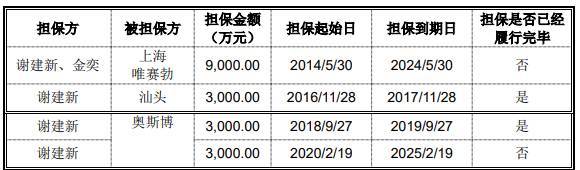 报告期内,公司实际控制人谢建新先后三次向中国民生银行股份有限公司汕头分行为汕头奥斯博贷款、开具承兑汇票、开立信用证、保函等授信业务提供最高额担保,担保金额均为3000.00万元,担保期限分别为自2016年11月28日至2017年11月28日、自2018年9月27日至2019年9月27日、自2020年2月19日至2025年2月19日。截至招股说明书签署日,唯赛勃及其子公司不存在为关联方提供担保的情况。