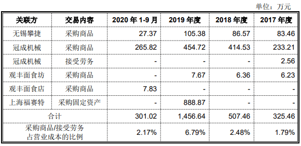 公司关联采购金额年年增长。2017年-2019年及2020年1-9月,唯赛勃向关联方采购商品、接受劳务的金额分别为325.46万元、507.46万元、1456.64万元、301.02万元,占营业成本的比例分别为1.79%、2.48%、6.79%、2.17%。