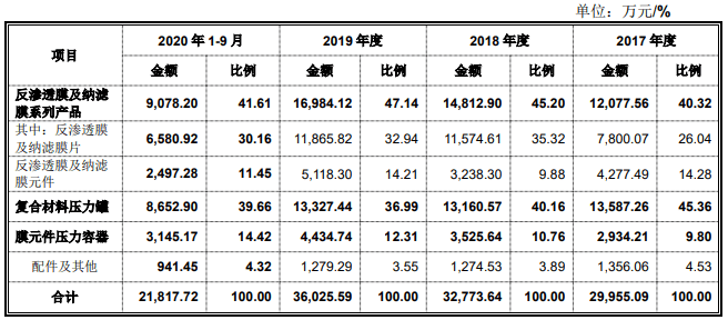 2017年-2019年及2020年1-9月,反渗透膜及纳滤膜系列产品收入占唯赛勃主营业务收入的比例分别为40.32%、45.20%、47.14%、41.61%;复合材料压力罐收入占比分别为45.36%、40.16%、36.99%、39.66%;膜元件压力容器收入占比分别为9.80%、10.76%、12.31%、14.42%。