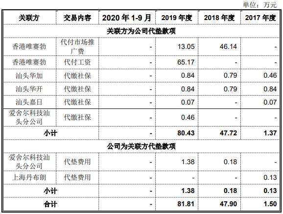 2018年、2019年,唯赛勃控股股东香港唯赛勃代唯赛勃子公司汕头奥斯博支付市场推广费46.14万元、13.05万元;2019年,香港唯赛勃曾为唯赛勃垫付美国唯赛勃管理人员工资65.17万元。报告期内,汕头华加、汕头华开、汕头嘉日和爱舍尔科技曾存在为子公司汕头奥斯博、汕头津贝特个别员工代垫社保的情形,金额较小。