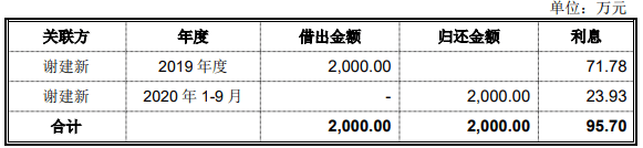 2019年3月,实际控制人谢建新向公司借款2000.00万元用于对外投资,按4.785%利率计息,利息共计95.70万元。截至2020年3月末,谢建新已向公司归还全部本金和利息。