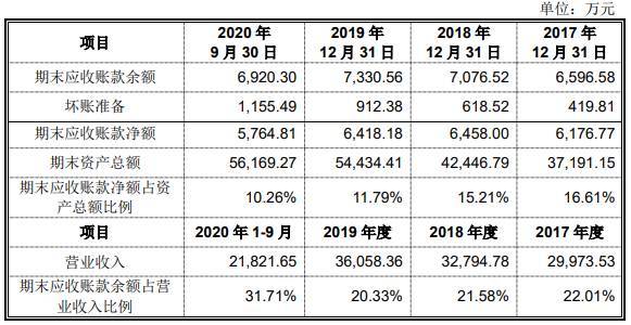 2017年-2019年及2020年1-9月,唯赛勃期末应收账款余额分别为6596.58万元、7076.52万元、7330.56万元、6920.30万元,占营业收入比例分别为22.01%、21.58%、20.33%、31.71%。坏账准备分别为419.81万元、618.52万元、912.38万元、1155.49万元,期末应收账款净额分别为6176.77、6458.00万元、6418.18万元、5764.81万元。