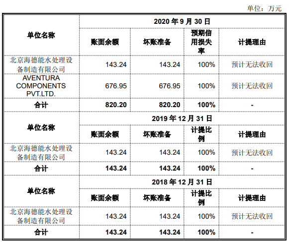 报告期内,公司存在因预计两家客户的货款无法回收按单项计提坏账准备的情形,其中2018年末客户北京海德能水处理设备制造有限公司经营不善、无法支付货款,公司对其全额计提坏账准备143.24万元;2020年3月末,客户Aventura Components Pvt.Ltd.因经营情况不善履行破产程序,公司预计货款无法收回,对其按单项计提了坏账准备676.95万元。