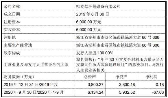 唯赛勃拟募集资金5.53亿元,其中2.30亿元用于“年产30万支复合材料压力罐及2万支膜元件压力容器建设项目”、1.57亿元用于“年产10万支膜元件生产线扩建项目”、5087.18万元用于“研发中心建设项目”、1.15亿元用于“补充流动资金项目”。