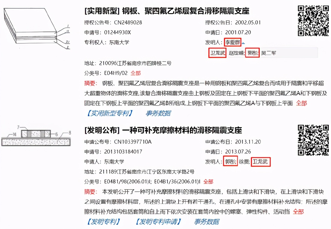 然而,据国家知识产权局披露,2001年7月,东南大学申请实用新型专利“钢板、聚四氟乙烯层复合滑移隔震支座”,发明人为李爱群、卫龙武、郭彤等。2013年7月,东南大学又申请发明专利“一种可补充摩擦材料的滑移隔震支座”,发明人包括郭彤、卫龙武。那么问题来了,既然卫龙武在1991年调离东南大学以后,未使用过土木工程学院相关物质条件进行过任何研究工作,为何又在2001年、2013年成了东南大学专利的发明人?