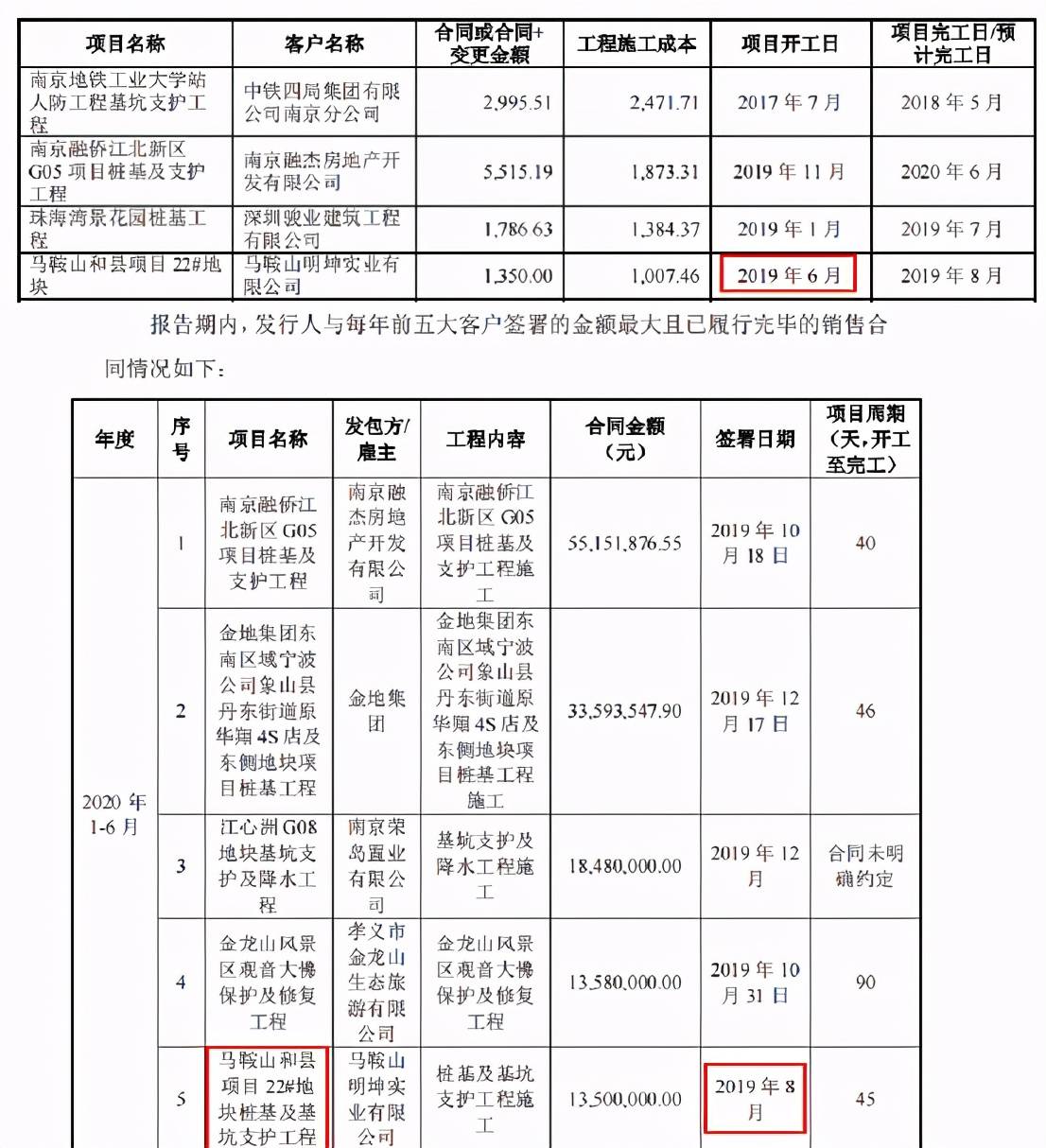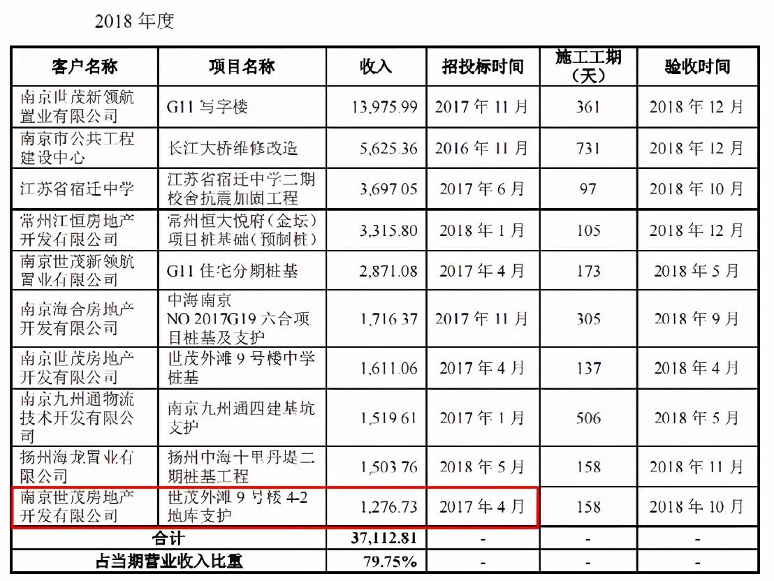招股书显示,世茂集团是南京(鸿基节能所在地)销售排名前列的房地产开发商,报告期内与公司合作了12个项目。其中,“世茂外滩9号楼4-2地库支护”项目的合同签署日期为2016年12月,合同金额为1408.25万元,已于2018年10月验收并确认收入。