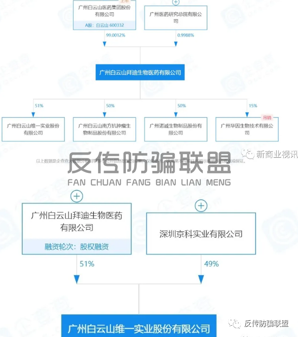 作为控股公司,广州白云山医药集团股份有限公司占股广州拜迪生物有限公司达98%。而2018年成立的广州白云山维一实业股份公司则是广州拜迪生物有限公司占股51%的子公司(深圳京科实业有限公司即原海基集团下设子公司占股49%),两家企业的法人代表均为黄明。股权路径分析显示,广州白云山维一实业股份有限公司最终受益人之一为广州白云山制药股份有限公司。