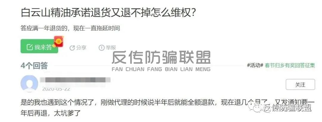 在百度搜索白云山维一植物精油代理词条时,可以看到有些代理商因销售不出去那么多精油而选择依照品牌给出的代理条例“无条件退换货”,但得到的反馈不是延迟退款就是一拖再拖,有的甚至得到回复需要再等上一年。