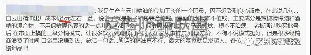 引用一位曾供职白云山维一植物精油代工厂的职工所诉,一瓶30ML成本价为5元的精油,被包装和分销之后成了接近两百元的产品,如果想要经营就要在起步投入3240元进30瓶维一精油成为省级经销商,本月同时招到3位省级经销商每人也购买30瓶维一精油成为省级,即3人x30瓶=90瓶,收入计算:(平级推荐奖)90瓶x10元=900元;第二个月复制裂变,指导教会每个省级经销商做推广招3个省级经销商,即90x3=270瓶,收入计算:(差额)270x20=5400元,此后完成5400的任务升为全国总经销商简称总代。白云山维一植物精油还制定了低投入、零风险、高回报,销售收入计划:(三三制)的运作指导。