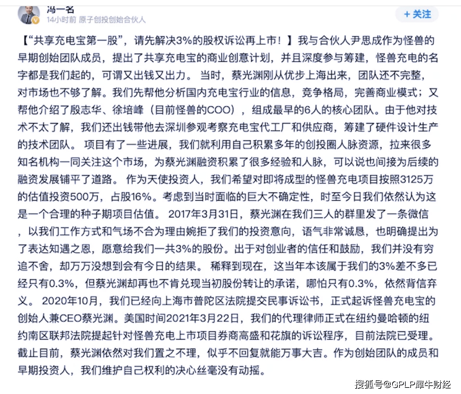 据冯一名表示,“其与尹思成是怪兽早期创始团队成员,提出了共享充电宝的商业创意计划,并且深度参与筹建,怪兽充电的名字都是我们起的,可谓又出钱又出力。2017年3月,蔡光渊在三人的微信群里承诺,为了表达知遇之恩,愿意给二人一共3%的股份。”