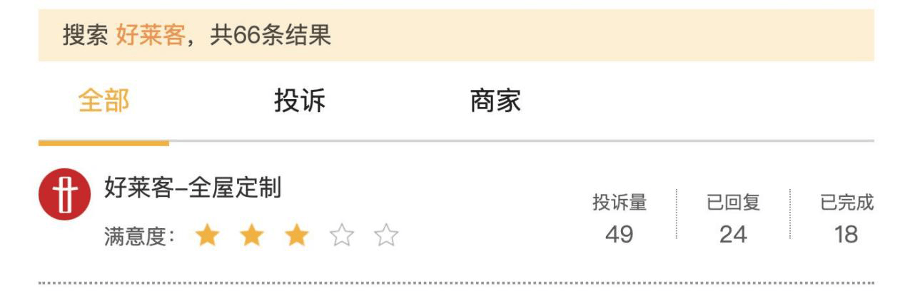 此外,好莱客还面临着品控不当,投诉频出的问题。黑猫投诉显示,好莱客投诉量累计49条,已回复24条,已完成18条,满意度评价三颗星。投诉内容多为家具质量不过关、工程交付不当、退款等售后服务不当位等。