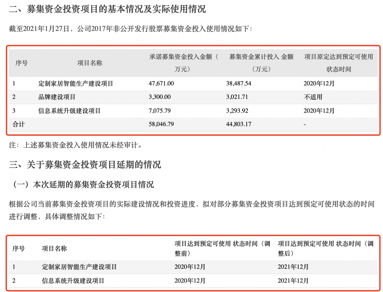 截至2021年1月27日,好莱客上述非公开发行股票募集资金投入使用情况分别为:“定制家居智能生产建设项目”承诺募集资金投入4.77亿元,累计投入3.85亿元,项目原定达到预定可使用状态时间为2020年12月;“品牌建设项目”承诺募集资金投入3300万元,累计投入3021.71万元;“信息系统升级建设项目”承诺募集资金投入7075.79万元,累计投入3293.92万元,项目原定达到预定可使用状态时间为2020年12月。