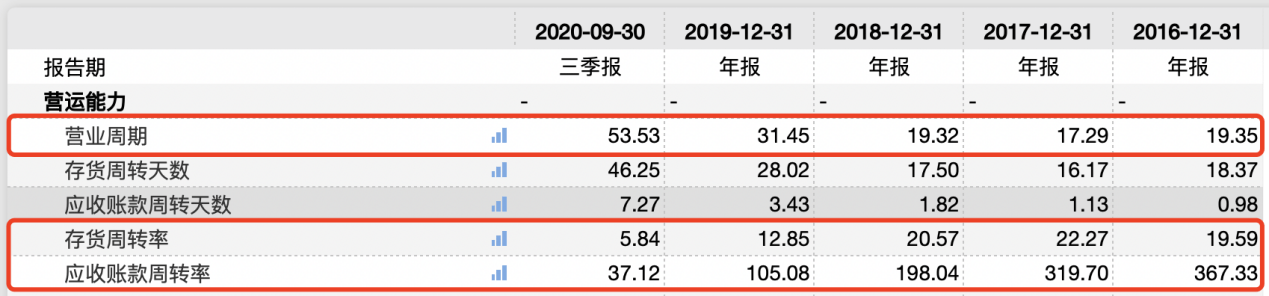 另一方面,好莱客营运能力走弱,营业周期变长,存货及应收账款周转率下降。Wind数据显示,2016年-2020年前三季度好莱客营业周期分别为19.35天、17.29天、19.32天、31.45天和53.53天;同期存货周转率分别为19.59%、22.27%、20.57%、12.85%、5.84%;同期应收账款周转率分别为367.33%、319.70%、198.04%、105.08%和37.12%。值得注意的是,营运能力的下降在2019年和2020年前三季度尤为显著,可见好莱客到了后期业绩周转之乏力。