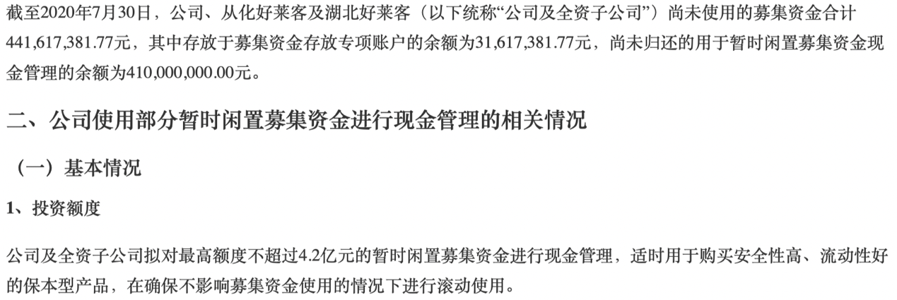 2020年7月31日,好莱客发布了关于使用部分暂时闲置募集资金进行现金管理的公告:截至2020年7月30日,好莱客及其全资子公司尚未使用的募集资金合计4.42亿元,其中存放于募集资金存放专项账户的余额为3161.74万元,尚未归还的用于暂时闲置募集资金现金管理的余额为4.1亿元。因此好莱客拟对最高额度不超过4.2亿元的暂时闲置募集资金进行现金管理,适时用于购买安全性高、流动性好的保本型产品,在确保不影响募集资金使用的情况下进行滚动使用。