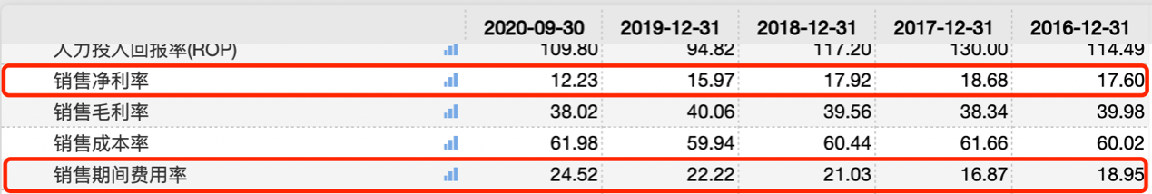 一方面,好莱客销售净利率持续下滑,期间费用率持续走高,利润空间进一步被削减。Wind数据显示,2016年-2020年前三季度好莱客销售毛利率分别为17.60%、18.68%、17.92%、15.97%和12.23%;同期期间费用率分别为18.95%、16.87%、21.03%、22.22%和24.52%。