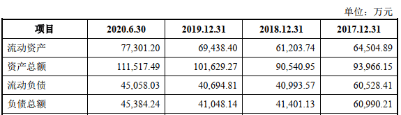 2017年至2020年6月末,流动资产分别为6.45亿元、6.12亿元、6.94亿元、7.73亿元;流动负债分别为6.05亿元、4.10亿元、4.07亿元、4.51亿元。