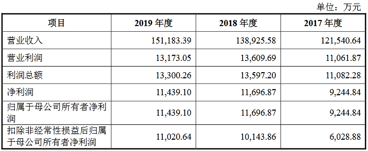 招股书显示,2016年至2020年,同力日升实现营业收入分别为11.03亿元、12.15亿元、13.89亿元、15.12亿元、17.49亿元;实现净利润分别为1.00亿元、9244.84万元、1.17亿元、1.14亿元、1.47亿元。
