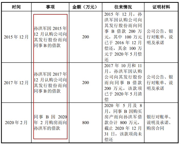 截至2020年12月底,孙洪军与公司董事、监事和高级管理人员以及核心技术人员等存在资金往来情况,而借钱的目的则各有不同:有认购公司自家股份但钱不够的、还有想买房但缺钱的。