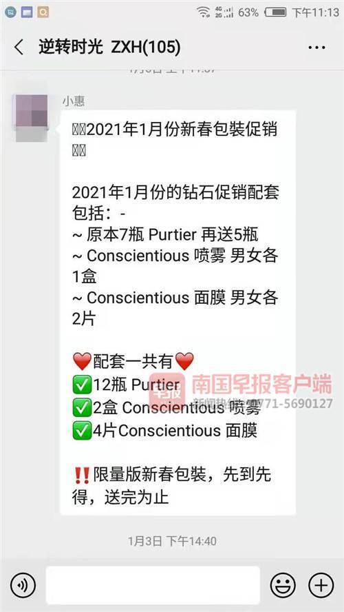 陈先生打开“逆转时光”的微信群,群内成员有100多人。记者看到,“小惠”不时发送介绍该款产品的视频、促销信息及康复病例,明示或暗示产品非比寻常的效果。比如,“肺癌晚期案例,医生判定只剩下6个月生命,停止化疗和一切药物,只服用purtier,康复案例。”