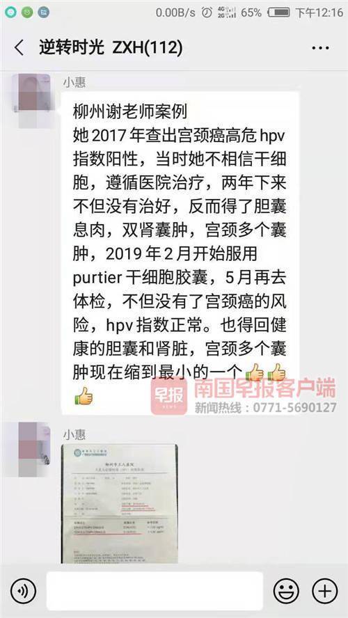 “小惠”打开自己的平板电脑,找出数十个包括白血病、宫颈癌、不孕不育、地中海贫血等康复的病例,让记者“见证”该产品的神奇效果。“小惠”称,该产品不含任何药物成分,为活细胞疗法,属于第三类康复医学,能修复人体的干细胞,意味着使用产品后所有的病都能得到改善。