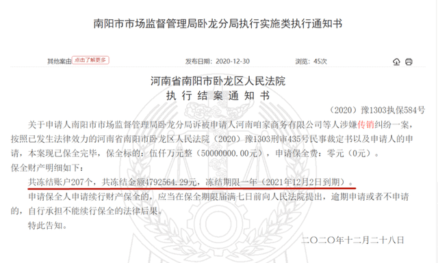 不久前,中国裁判文书网发布一则题为《南阳市市场监督管理局卧龙分局执行实施类执行通知书》(以下简称:《执行通知书》)。