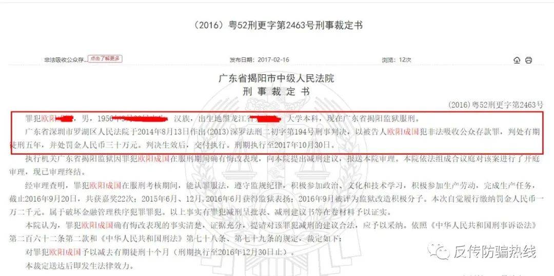 此外,值得注意的是,有网友跟李旭反传销团队反馈,咱家赚多多董事长欧阳成国就曾因为传销被逮捕,在广东省揭阳市监狱服刑。