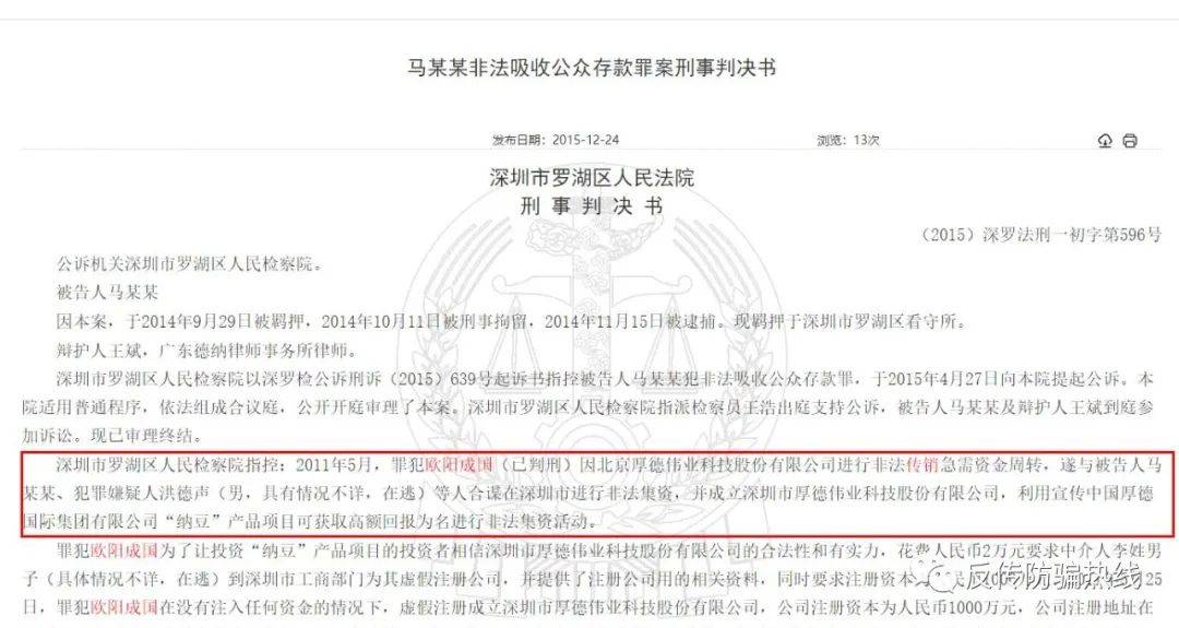 《马某某非法吸收公众存款罪案刑事判决书》提到,深圳市罗湖区人民检察院指控:2011年5月,罪犯欧阳成国(已判刑)因北京厚德伟业科技股份有限公司进行非法传销急需资金周转,遂与被告人马某某、犯罪嫌疑人洪X声(男,具有情况不详,在逃)等人合谋在深圳市进行非法集资,并成立深圳市厚德伟业科技股份有限公司,利用宣传中国厚德国际集团有限公司“纳豆”产品项目可获取高额回报为名进行非法集资活动。