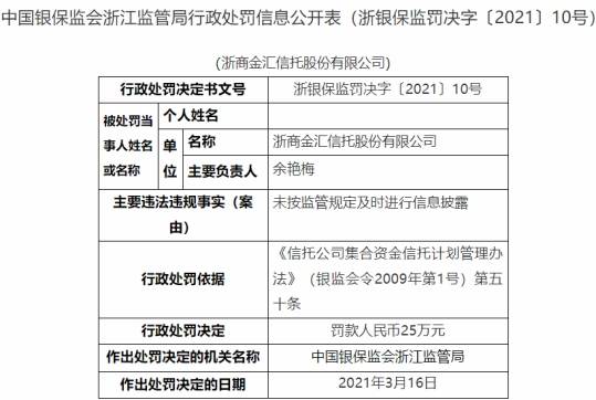 中国经济网北京3月26日讯 银保监会网站昨日发布中国银保监会浙江监管局行政处罚信息公开表(浙银保监罚决字〔2021〕10号),浙商金汇信托股份有限公司(以下简称“浙商金汇信托”)存在未按监管规定及时进行信息披露的违法违规事实,中国银保监会浙江监管局于2021年3月16日决定对其罚款人民币25万元,行政处罚依据为《信托公司集合资金信托计划管理办法》(银监会令2009年第1号)第五十条。