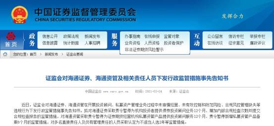 3月24日,证监会对海通证券、海通资管及相关责任人员下发行政监管措施事先告知书。经查,海通证券、海通资管及相关人员在开展投资顾问、私募资管业务过程中,未按照审慎经营原则,有效控制和防范风险,对市场造成严重负面影响。在2019年12月证监会指导沪深交易所发布了《关于规范公司债券发行有关事项的通知》后,海通证券、海通资管仍存侥幸心理,在其他交易市场继续从事相关违规行为。同时,海通证券、海通资管未将相关业务行为纳入全面合规风控体系,业务隔离、利益冲突防范、债券交易管理等存在漏洞,公司合规风控机制存在缺失。根据违规事实和相关规定,证监会拟对海通证券、海通资管采取前述监管措施,并对相关责任人员严肃追责。