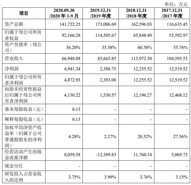 财务数据显示,中图科技2017年、2018年、2019年、2020年前9月营收分别为10.46亿元、11.40亿元、8.57亿元、6.69亿元;同期对应的分别为1.25亿元、1.23亿元、2388.75万元、4941.34万元。