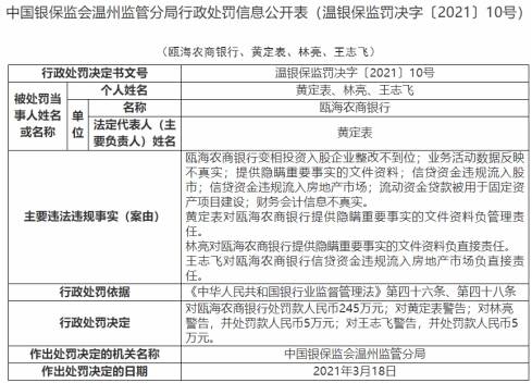 黄定表对瓯海农商银行提供隐瞒重要事实的文件资料负管理责任;林亮对瓯海农商银行提供隐瞒重要事实的文件资料负直接责任;王志飞对瓯海农商银行信贷资金违规流入房地产市场负直接责任。中国银保监会温州监管分局于2021年3月18日决定对黄定表警告;对林亮警告,并处罚款人民币5万元;对王志飞警告,并处罚款人民币5万元。