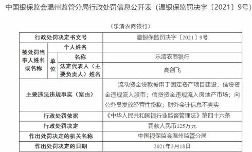 中国经济网北京3月26日讯 银保监会网站今日发布中国银保监会温州监管分局行政处罚信息公开表(温银保监罚决字〔2021〕9号),乐清农商银行存在流动资金贷款被用于固定资产项目建设;信贷资金违规流入股市;信贷资金违规流入房地产市场;向公务员发放经营性贷款;财务会计信息不真实违法违规事实,中国银保监会温州监管分局于2021年3月18日决定对其罚款人民币125万元,行政处罚依据为《中华人民共和国银行业监督管理法》第四十六条。