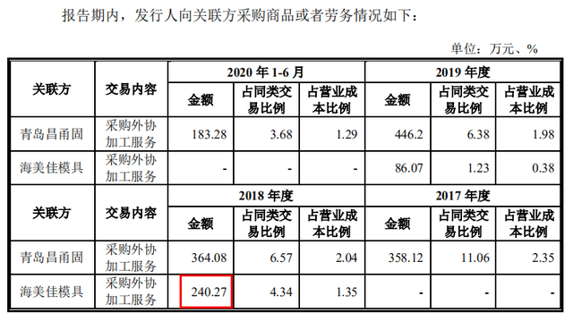 奇怪的是,海泰科在2018年向海美佳模具采购了240.27万元的外协加工服务,较海美佳模具的当期总营业收入高出43%,差异幅度远高于增值税税率。换言之,即使海美佳模具仅有海泰科这一个客户,其2018年收入也理应不止168.02万元。至于为什么会出现这一矛盾,还需要拟上市公司进一步解释。