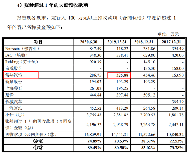 据招股书披露,常熟市汽车饰件股份有限公司(证券代码:常熟汽饰,证券简称:603035.SH)是海泰科2019年第四大客户,贡献了2864.25万元收入,占比8.38%。截至2019年12月31日,海泰科对常熟汽饰的1年以上大额预收款项金额为325.88万元,也就是说,公司当期对常熟汽饰的预收款项总金额至少为325.88万元。