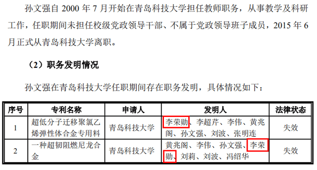 招股书显示,海泰科的实际控制人为孙文强、王纪学。其中,孙文强曾于2000年7月至2015年6月在青岛科技大学担任教师职务,在校任职期间,孙文强存在2项职务发明,联合发明人李荣勋现为青岛科技大学高性能聚合物研究院教授。巧合的是,青岛新材料的第一大股东也叫做李荣勋,持股比例为39.63%,而青岛科技大学则通过青岛科技大学科技公司间接持有青岛新材料3.05%的股份。