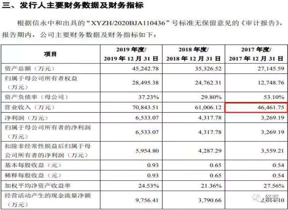 2017年至2020年1-6月,西安凯立营业收入分别为4.65亿元、6.10亿元、7.08亿元、5.19亿元,净利润分别为3269.19万元、4317.78万元、6533.07万元、5834.46万元。